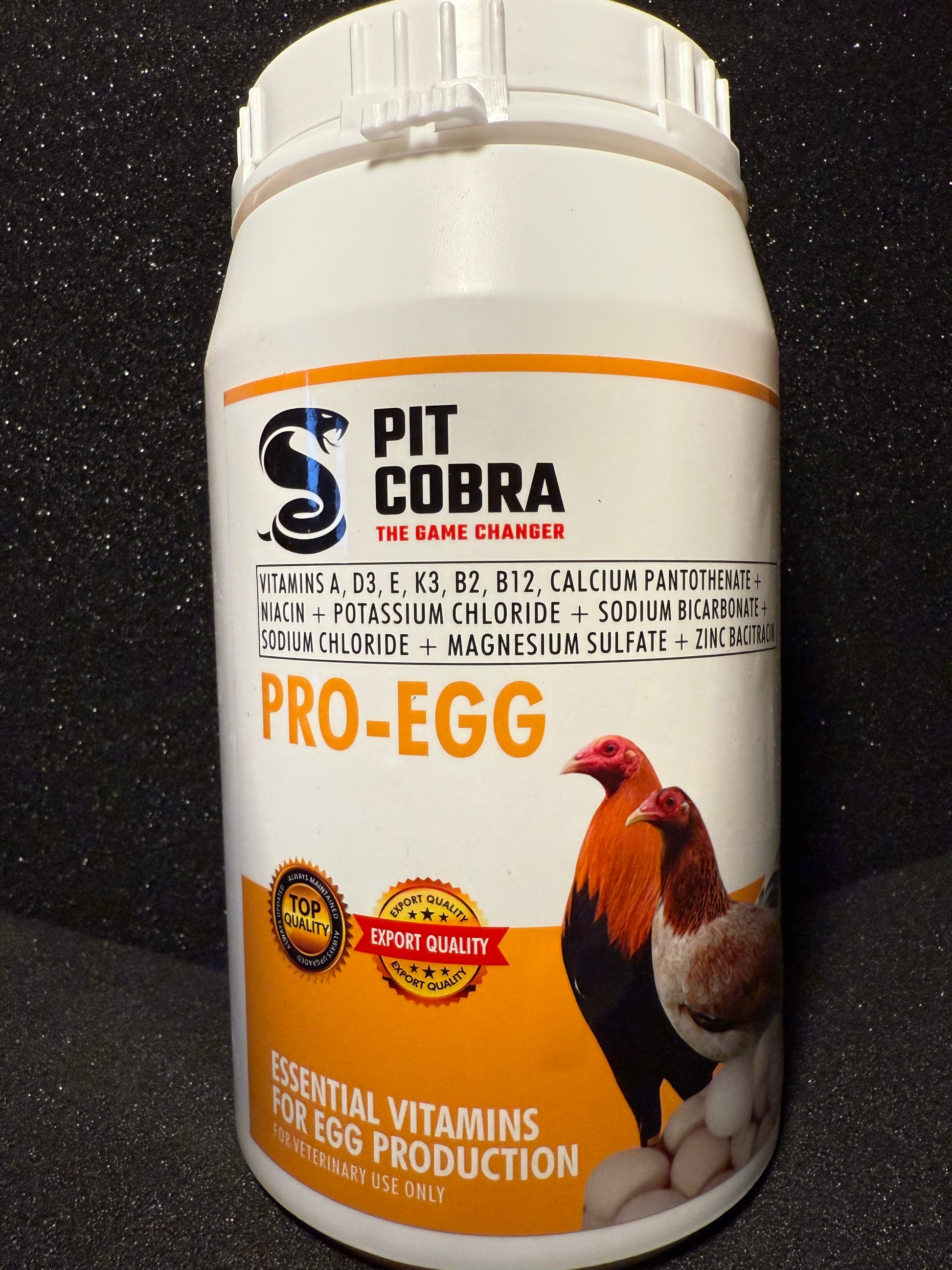 Pit Cobra Pro-Egg is a high-quality nutritional supplement powder developed to maximize egg production, shell strength, and fertility in poultry. With a balanced blend of essential vitamins, minerals, and reproductive support nutrients, it helps maintain peak laying performance, improves hatchability, and ensures strong, marketable eggs. The 1kg tub provides an economical solution for medium to large-scale poultry farms requiring consistent supplementation.